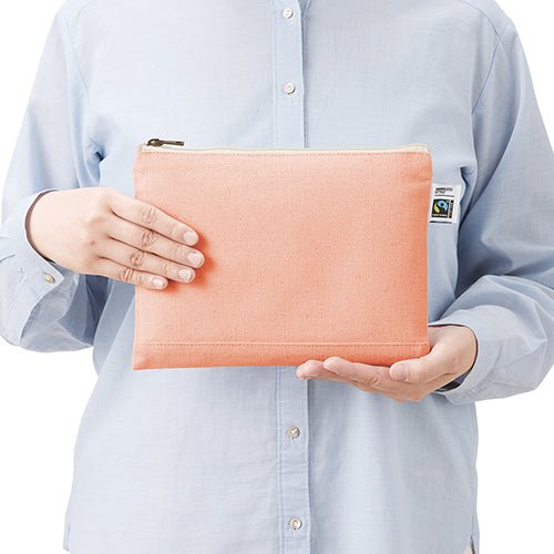 丈夫な生地感のシンプルデザインのキャンバスポーチです。メイク道具・スマホギアなどを入れやすい普段使い向きのサイズ感になっています。「国際フェアトレード認証ラベル」が付いているアイテムで、SDGsを意識したアイテムです。