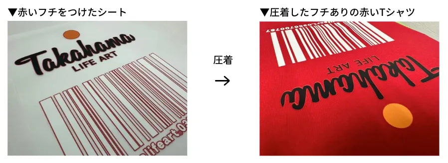 完成した転写フィルムをカットし、熱プレス機で圧着。圧着時にパウダーが溶け、デザインが生地に転写される仕組みです。