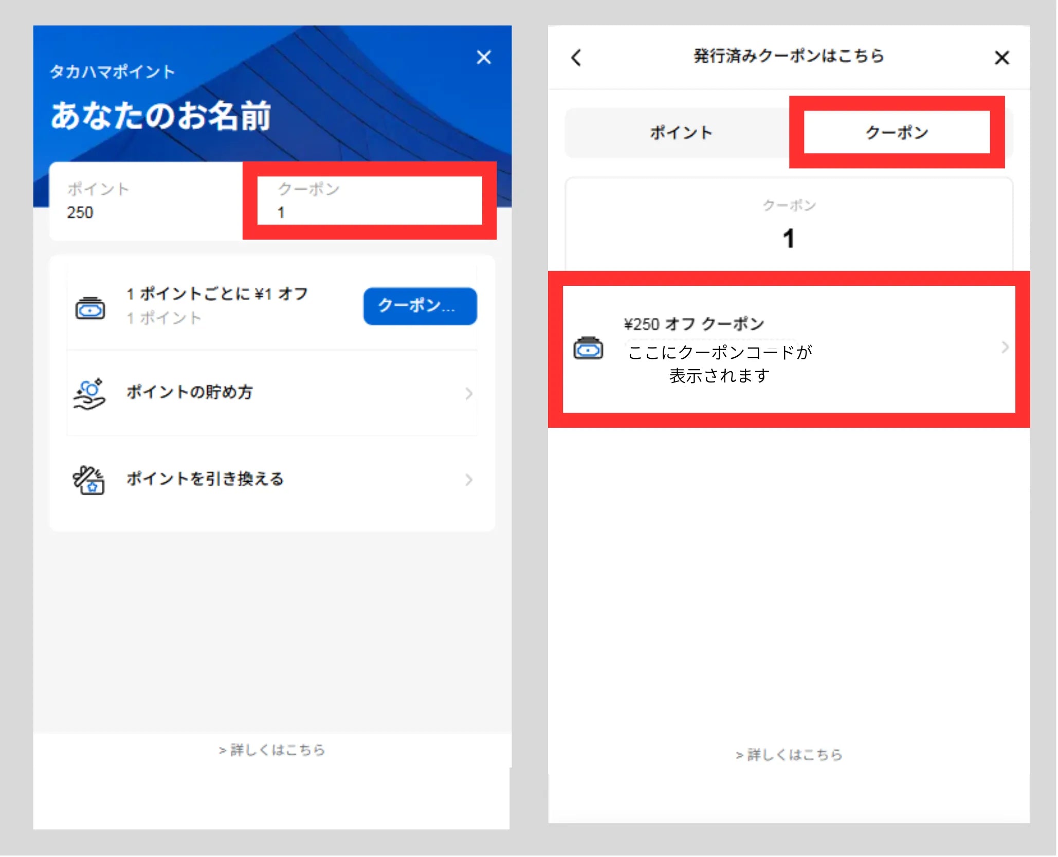 貯まったポイントをクーポンに変換するには、「ポイントを引き換える」を選択し、「クーポン発行」を選択してください。